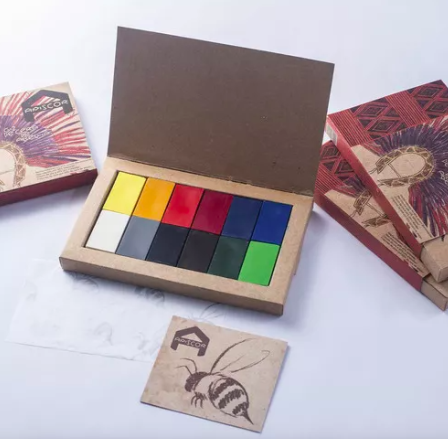 - Amarelo limão - Amarelo ouro - Laranja - Vermelho claro - Vermelho escuro - Violeta - Azul ultramar - Azul da prússia - Verde esmeralda - Verde claro - Umbra - pêssego