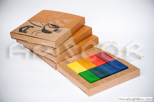 - Amarelo limão - Amarelo ouro - Vermelho claro - Vermelho escuro - Azul ultramar - Azul da prússia - Verde escuro - Verde claro