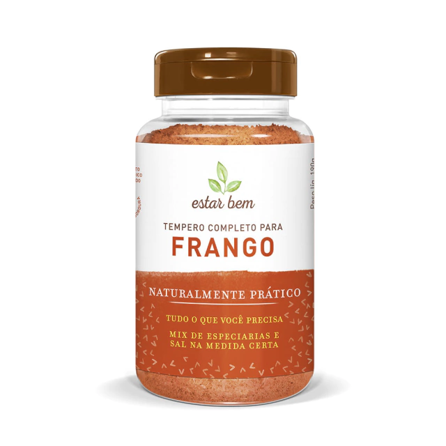 Ingredientes: Sal do Himalaia, alho, cebola, cúrcuma, urucum, pimenta do reino, louro, alecrim, sálvia, aipo, limão, zimbro, endro e tomilho. No Tempero Completo para Frango encontramos o equilíbrio de sabores entre os condimentos e o alho com um suave toque de limão; além de trabalhar com o urucum.